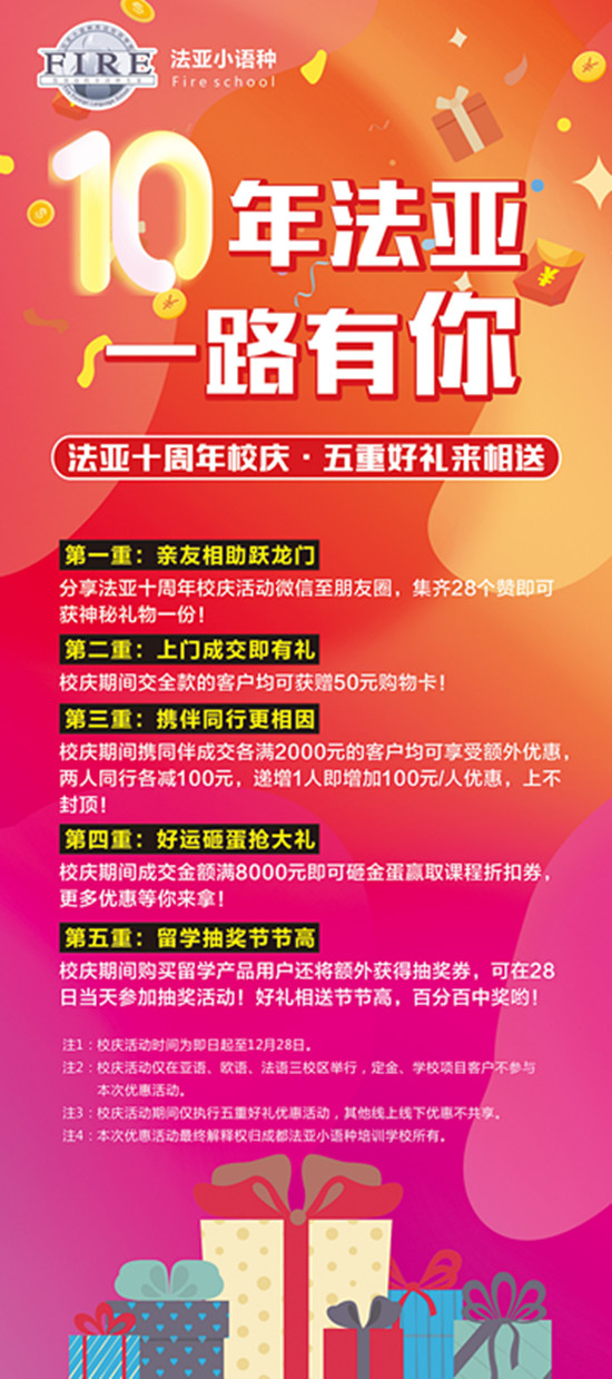 法亞小語(yǔ)種建校十周年,累計(jì)培養(yǎng)學(xué)生五萬(wàn)余人,語(yǔ)言+留學(xué)一站式服務(wù)!來(lái)法亞,你要做的只有學(xué)習(xí),剩下的我們替你搞定!十周年校慶開啟!萬(wàn)元抽獎(jiǎng)、千元課程優(yōu)惠等你來(lái)拿!